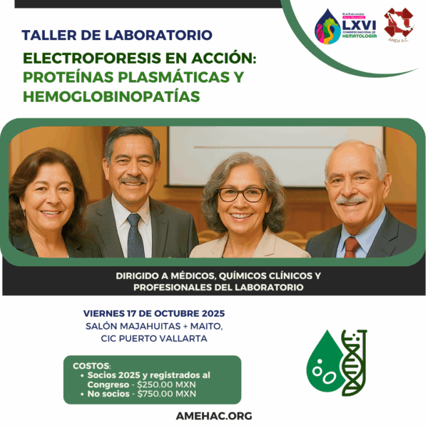 En el marco del LXVI Congreso Nacional de Hematología AMEH 2025, te invitamos a participar en el Taller de Laboratorio: Electroforesis en Acción, enfocado en el análisis de proteínas plasmáticas y hemoglobinopatías, herramientas clave para el diagnóstico clínico hematológico.